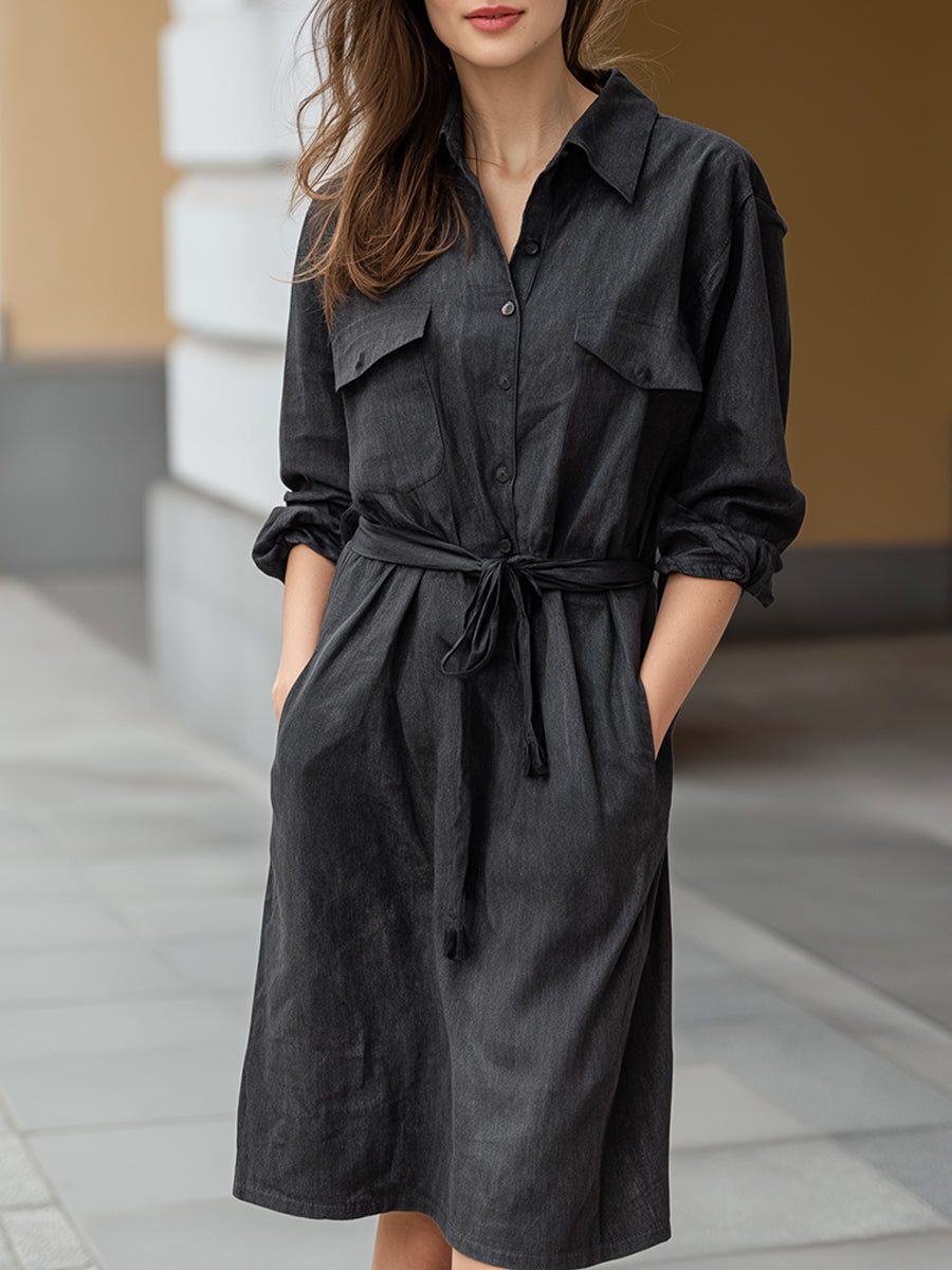 - Hönnun: Skyrtukjóll með hnöppum að framan, klassískur kragi, brjóstvasar með flipa, stillanleg mittisband, uppbrettanlegar ermar