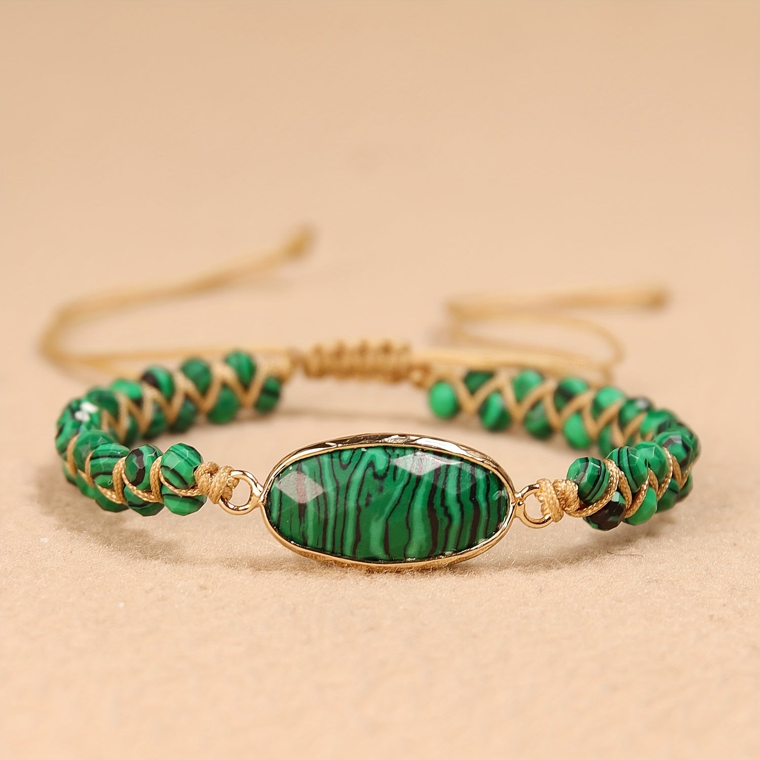Þetta handofna armband úr grænu malakíti með fíngerðum gullskreytingum er blanda af glæsileika og boho-stíl. Fullkomið fyrir daglegt notkun eða notkun tilefnis, að undirstrikar náttúrulega fegurð handarinnar.