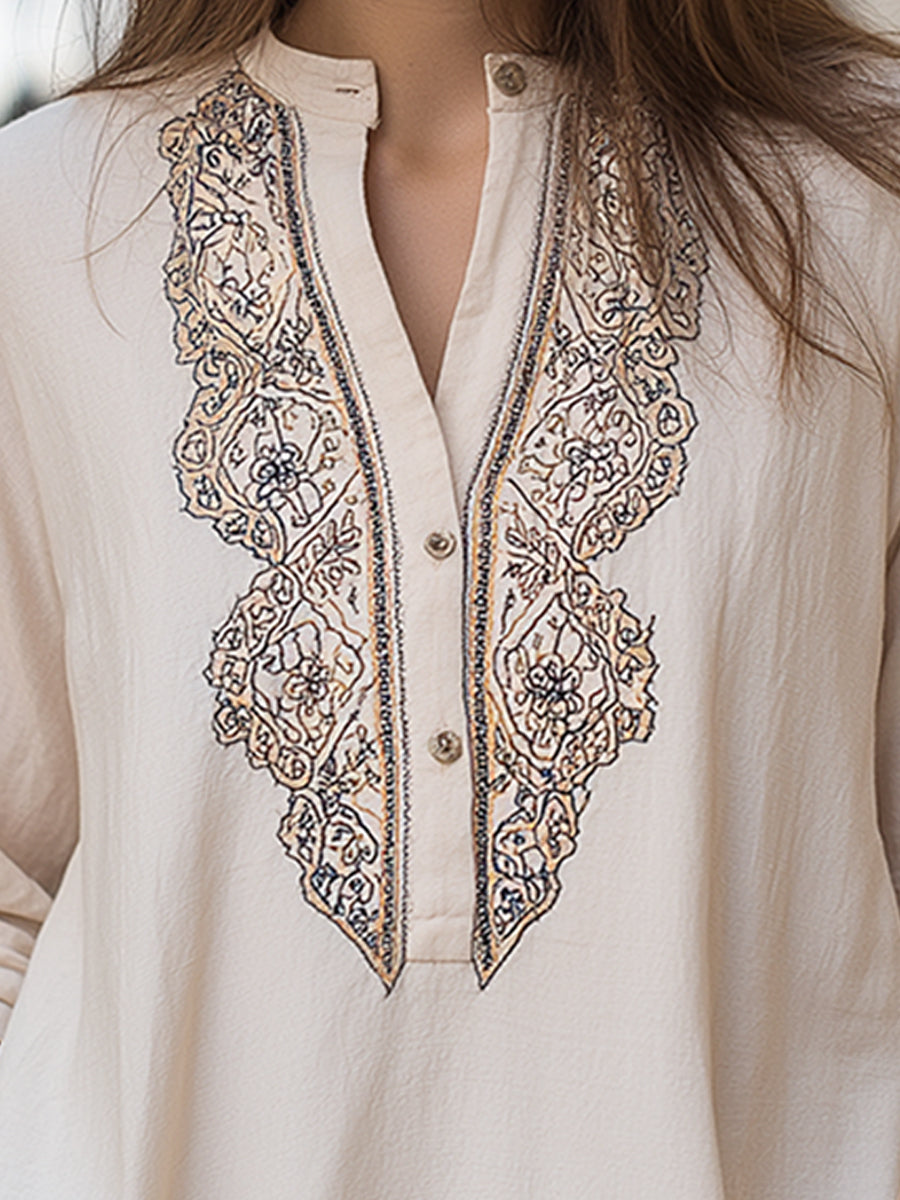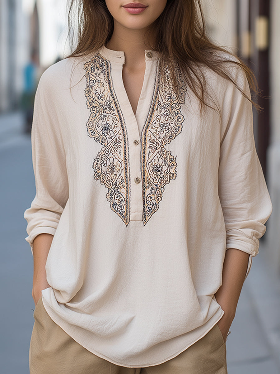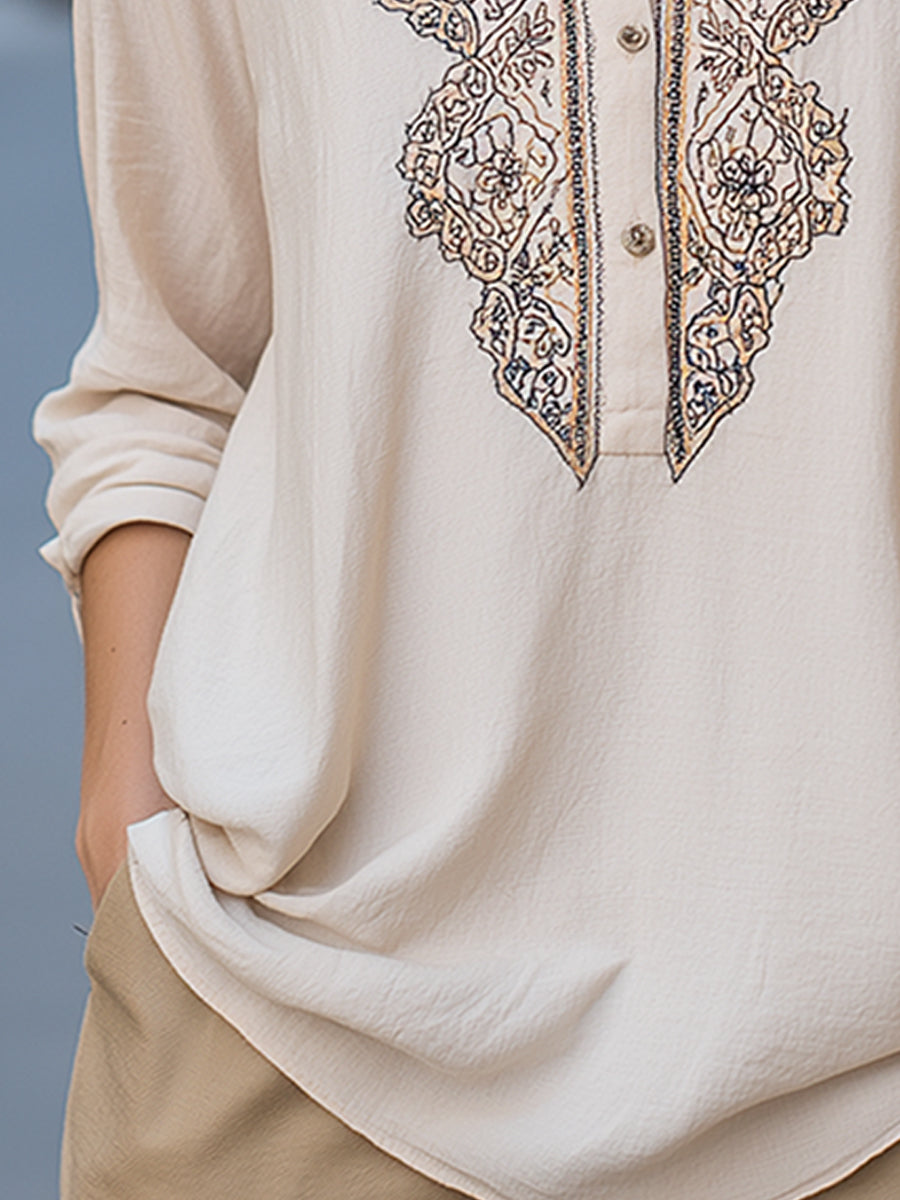 Þessi blússa með útsaumuðum hálsmáli, sem er með löngum ermum, blandar saman tímalausri glæsileika og afslappaðri nútímalegri stíl og býður upp á fágaða en samt óþreytandi nauðsynjar í fataskápnum. Hún er hönnuð fyrir konur sem kunna að meta fínlega handverksmennsku og fjölhæfar sniðmát og færir daglegum klæðnaði glæsilegan og handverkslegan blæ.