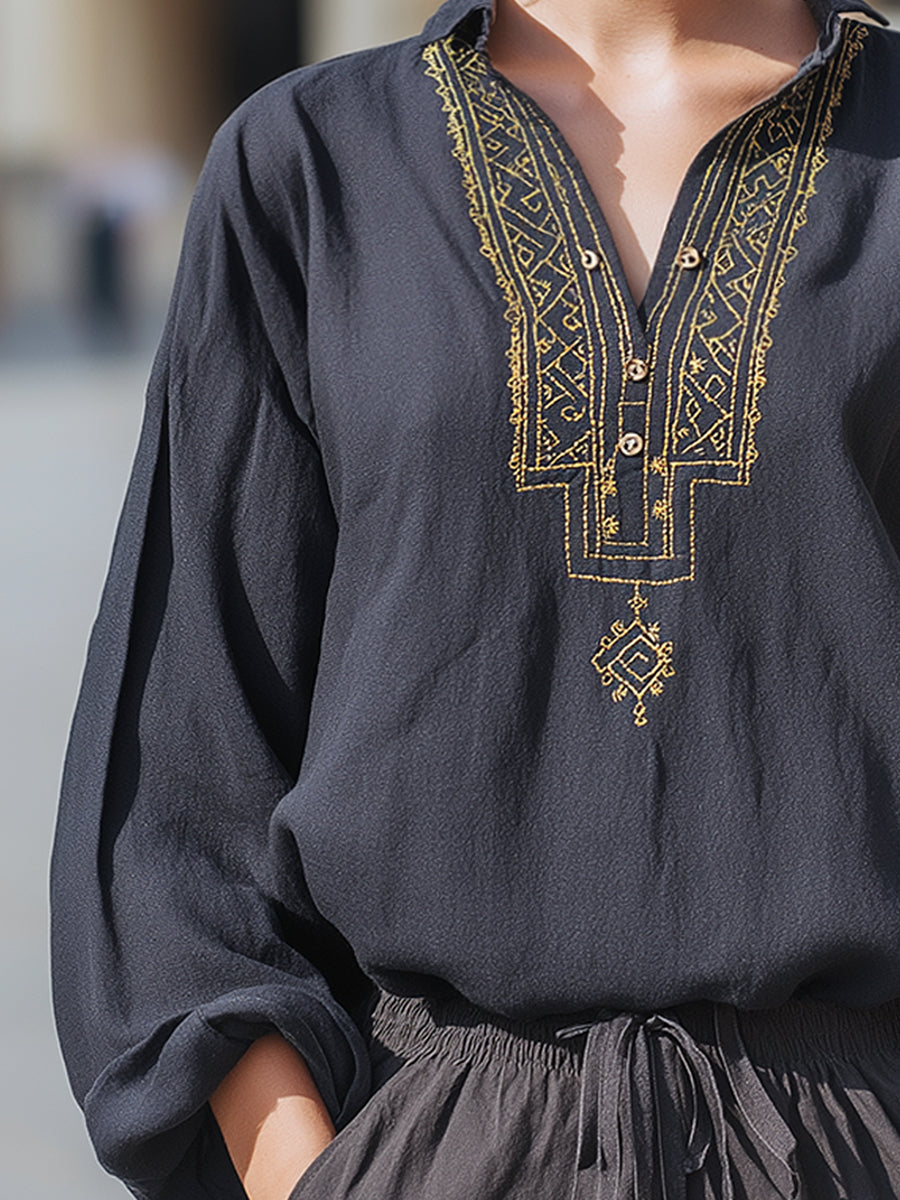 Þessi blússa með útsaumuðum, klofnum kraga og löngum ermum blandar saman handverkslegum smáatriðum og afslappaðri fágun, sem gerir hana að glæsilegri en samt óformlegri viðbót við nútíma fataskáp. Þessi flík er hönnuð fyrir konur sem kunna að meta fágaða handverksmennsku og tímalausar sniðmát og býður upp á fullkomna jafnvægi milli þæginda og sjónræns aðdráttarafls.