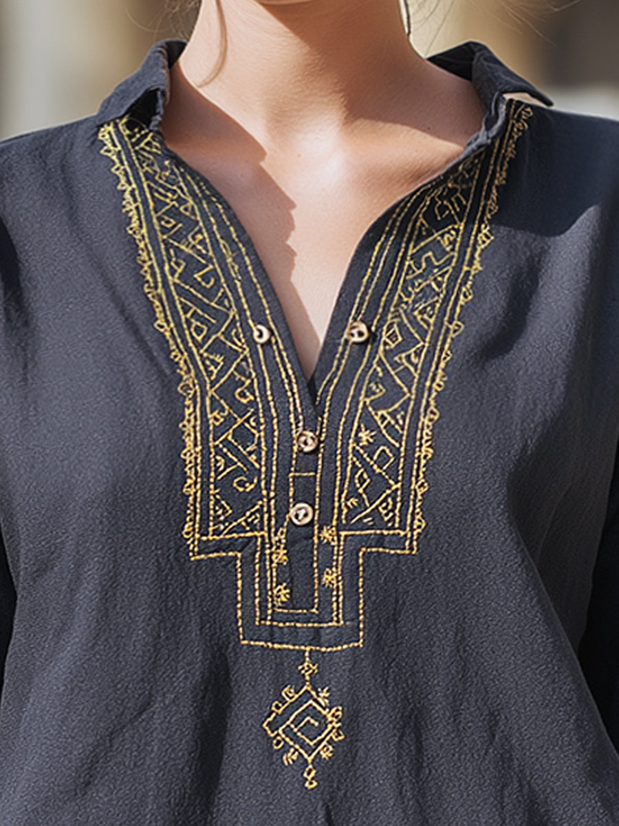Mjúklega skipt hálsmál er innrammað með flóknum rúmfræðilegum útsaum, vandlega saumuðum til að skapa áberandi lóðréttan áherslupunkt. Útsaumurinn nær niður miðju framan, bætir við dýpt og karakter og lengir um leið sniðið lúmskt. Hálsmálið er frágengið með fínlegum hnappaskreytingum og gerir kleift að stilla stíl, allt frá afslappaðri opnun til snyrtilega festrar fyrir fágaðra útlit.