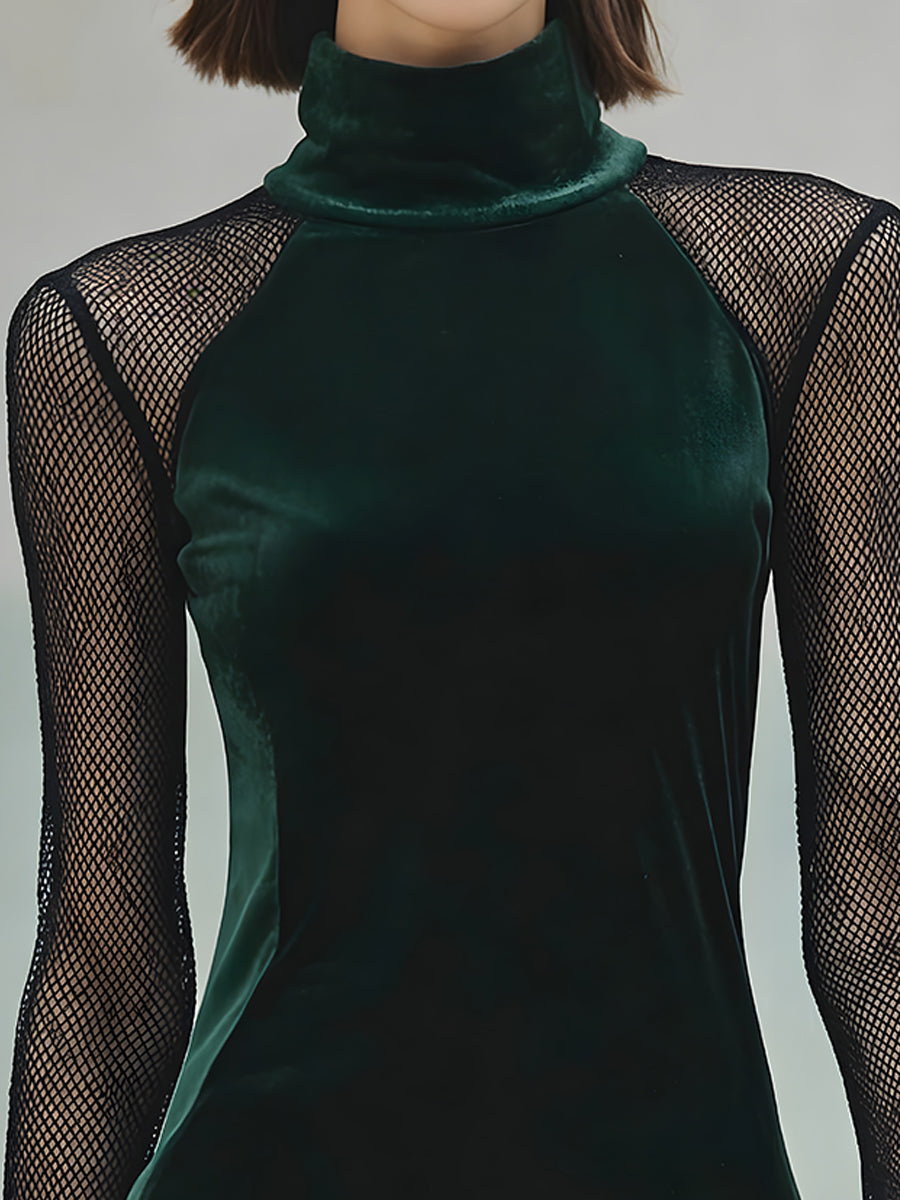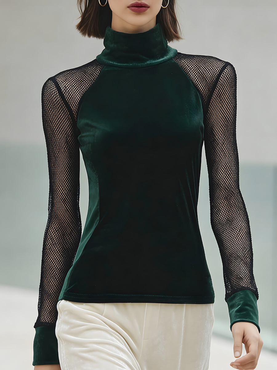Þessi Emerald Velvet möskva-erma toppur með háum hálsmáli blandar saman nútímalegri fágun og dramatískri glæsileika. Hann er úr lúxus, djúpum, smaragðsgrænum flaueli og hefur mjúkan gljáa sem eykur ríka gimsteinsáferðina. Háa hálsmálið bætir við fágaðri og skúlptúrlegri nærveru, á meðan aðsniðna sniðið mótast mjúklega að líkamanum og skapar straumlínulagaða og flatterandi lögun. Andstæður gegnsæjar möskva-ermar kynna kraftmikið samspil áferða, sem býður upp á bæði öndun og sjónræna aðdráttarafl. Fín nethönnun nær frá öxl niður að úlnlið og skapar glæsilegt gegnsæi sem lyftir flíkinni úr klassískri yfir í nútímalega. Flauelsmanchetten festa ermarnar með fágaðri áferð, sem jafnar upp áferð og kvenleika.