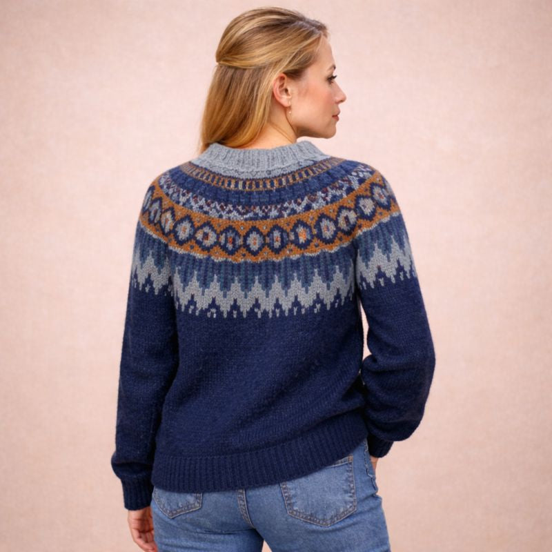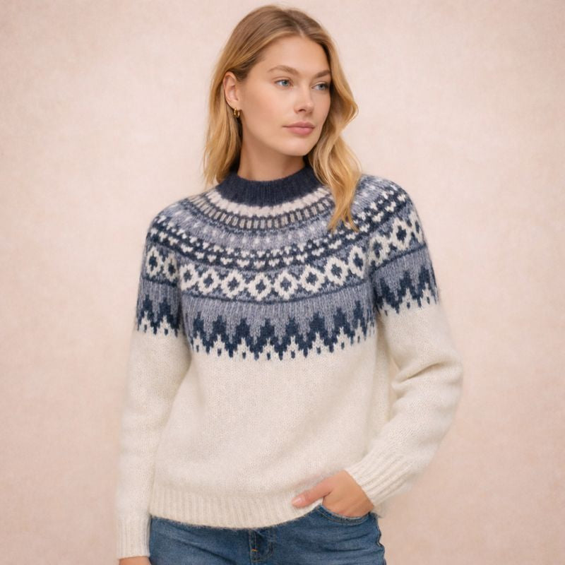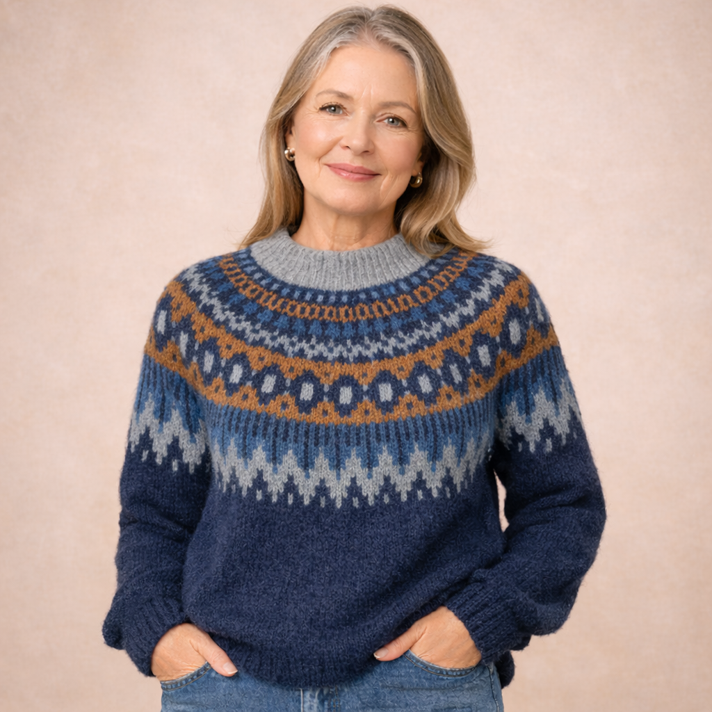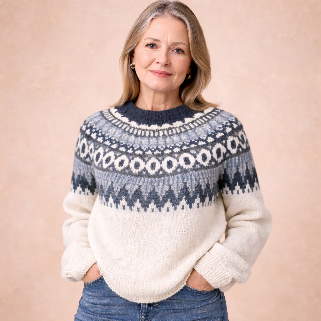 Uppgötvaðu hina klassísku peysu, flík sem er innblásin af sjarma norrænnar prjónahefðar. Mjúk áferð, hefðbundið munstur og náttúruleg þægindi gera hana að ómissandi flík sem veitir bæði hlýju og glæsileika á köldum dögum.
