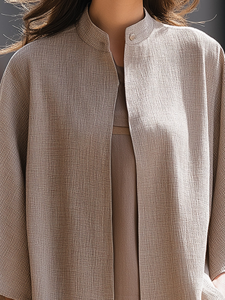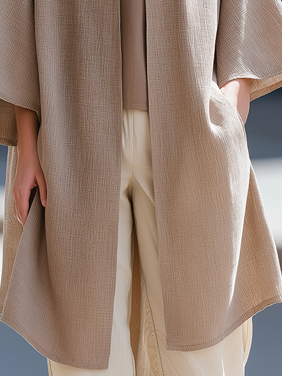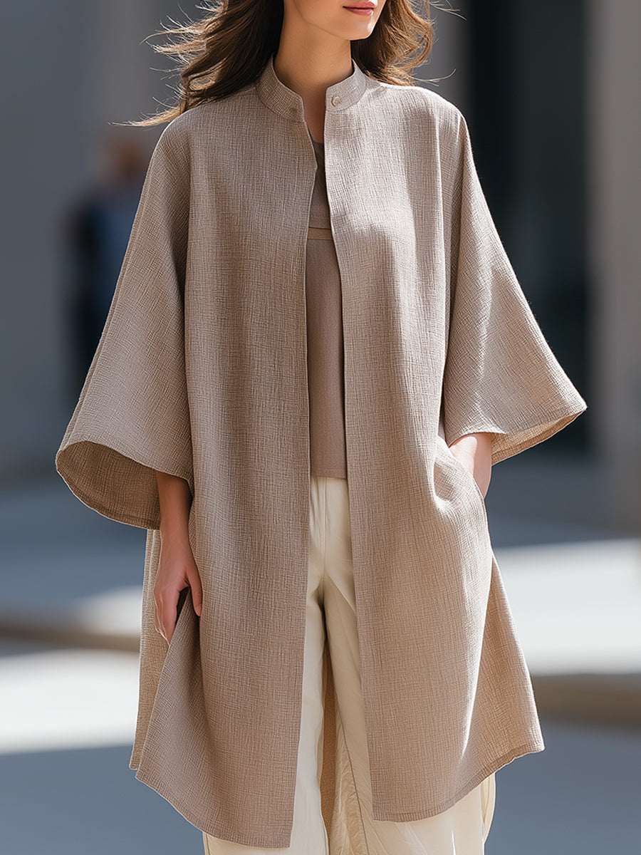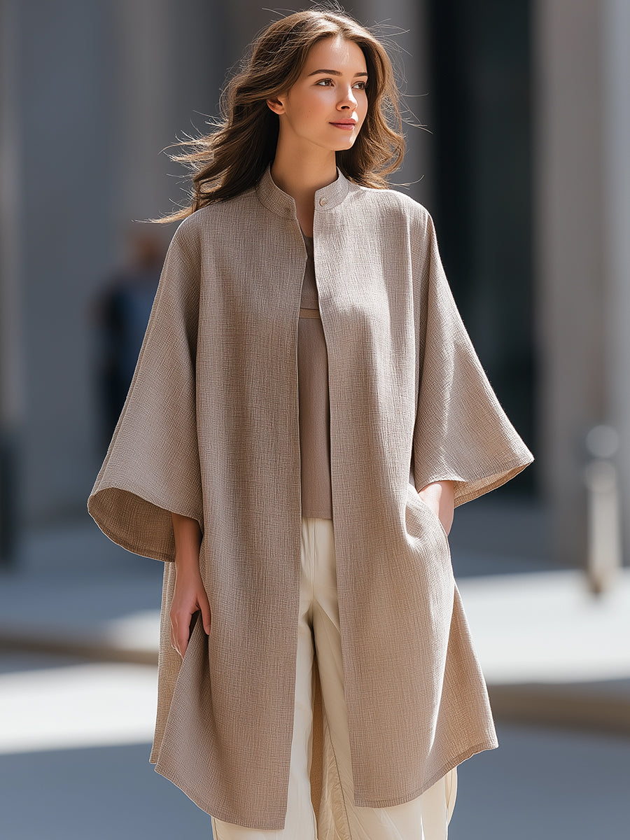 Þessi afslappaði jakki með opnu framhliði býður upp á látlausa glæsileika og áreynslulausa lagskiptingu, hannaður fyrir konur sem kunna að meta fágaðar sniðmátir með náttúrulegu, nútímalegu yfirbragði. Jakkinn er úr mjúku áferðarefni úr línblöndu og fellur mjúklega yfir líkamann og skapar rólega, byggingarlistarlega nærveru sem lyftir daglegum klæðnaði upp.