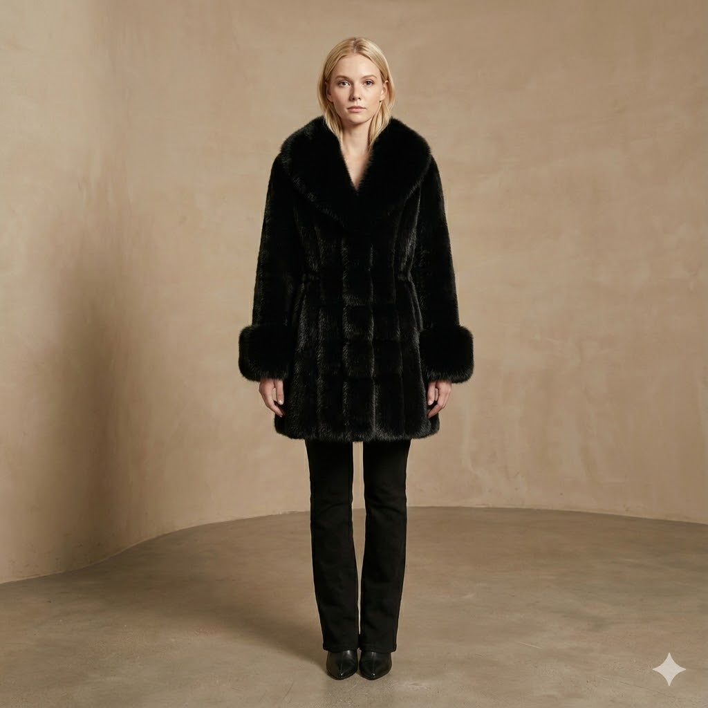 Seraphine Velvet kápan okkar er úr gervifeldi og veitir hlýju og glæsileika í köldu veðri. Mjúk áferð hennar og víður kragi lyfta hvaða kvöld- eða vetrarklæðnaði sem er og er hin fullkomna viðbót við vetrarfataskápinn þinn.