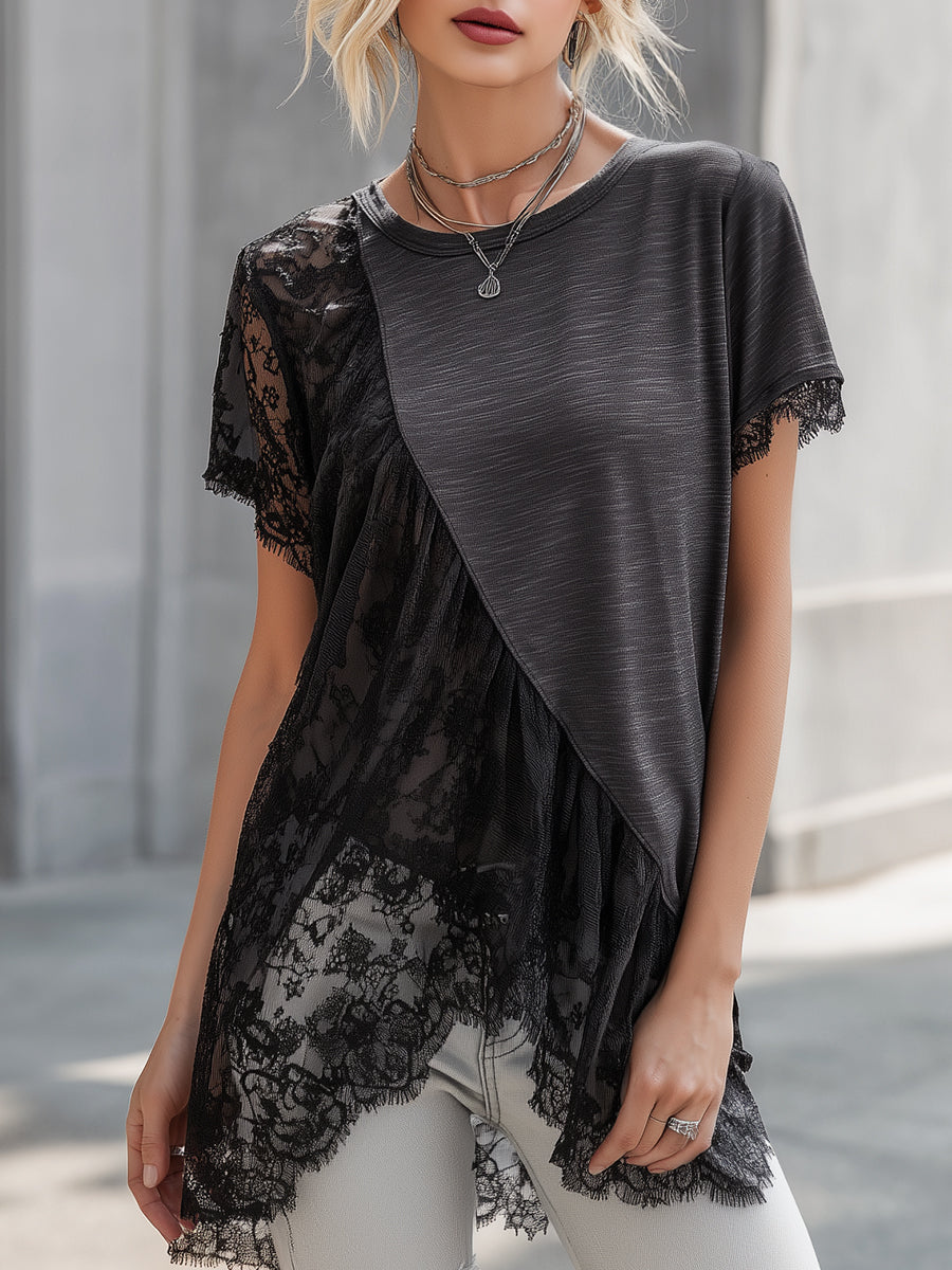 Þessi dökkgrái toppur sameinar kvenleika og einstaklingshyggju, skapar áreynslulaust rómantískt og þægilegt hversdagslegt útlit og bætir við skærleika í frjálsleg föt. Lúxus, mjúkt rayon-spandex blandað efni líður eins og önnur húð, létt, andar vel og er með miðlungs teygjanleika, sem gerir kleift að hreyfa sig frjálslega frá morgunkaffi til kvöldverðar. Svartur blómablúnduskraut á stuttum ermum og áberandi ósamhverfur faldur bætir við fíngerðri áferð og sjónrænum áhuga, sem gerir þennan grunn topp strax augnayndi. Laus, flæðandi sniðið klæðir fullkomlega allar líkamsgerðir, á meðan ósamhverfur blúnduskrauturinn á faldinum bætir við krafti og tryggir að þú lítir út fyrir að vera glæsilegur og heillandi í hverju skrefi.