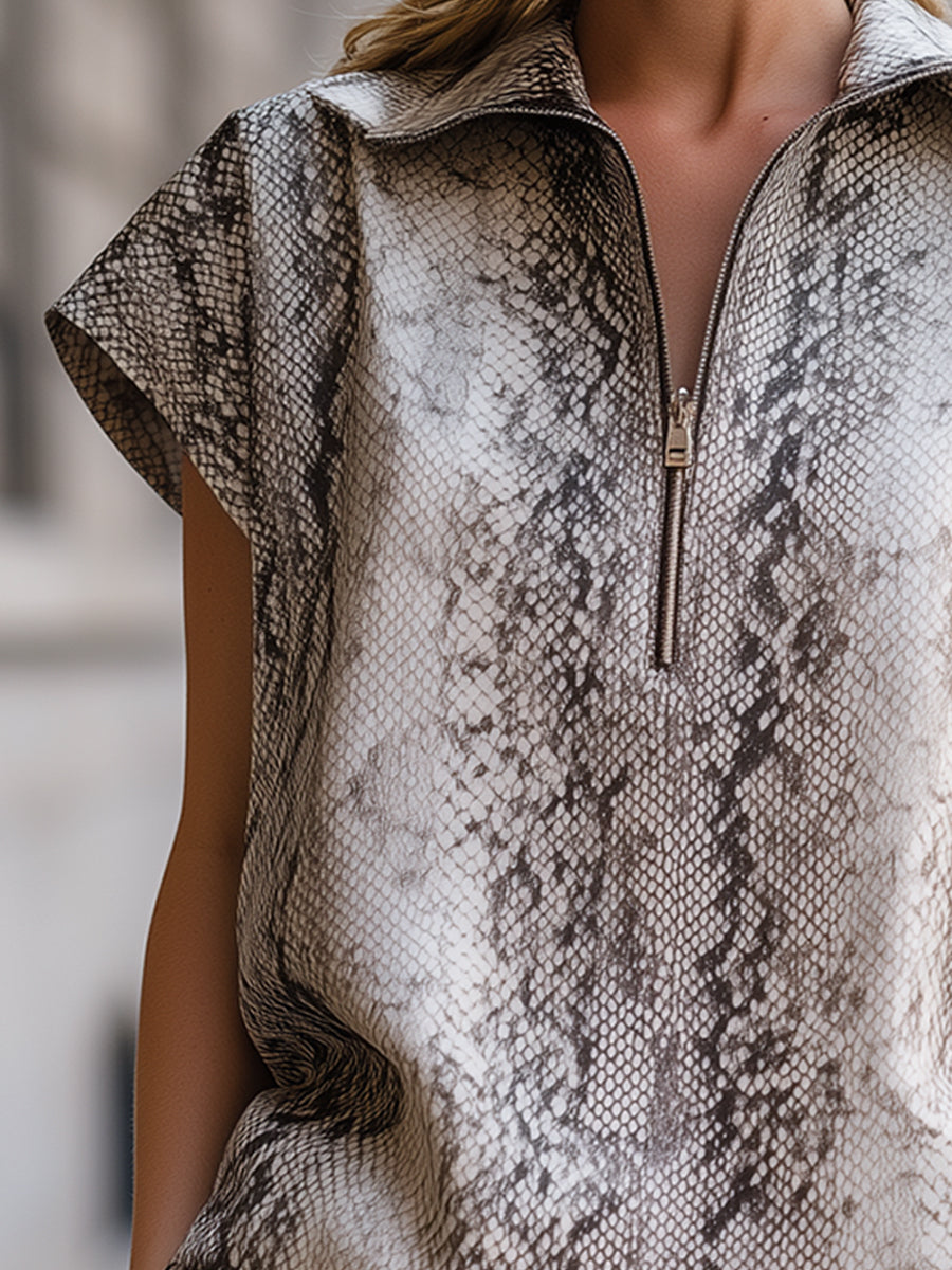 Þessi afslappaði toppur með snákamynstri og rennilás í hálsmáli býður upp á örugga blöndu af nútímalegum blæ og áreynslulausri fágun. Hannaður fyrir konur sem kunna að meta áberandi áferð í jafnvægi við hreinar sniðmát, þessi flík veitir sjónræna dýpt án þess að skerða fjölhæfni.