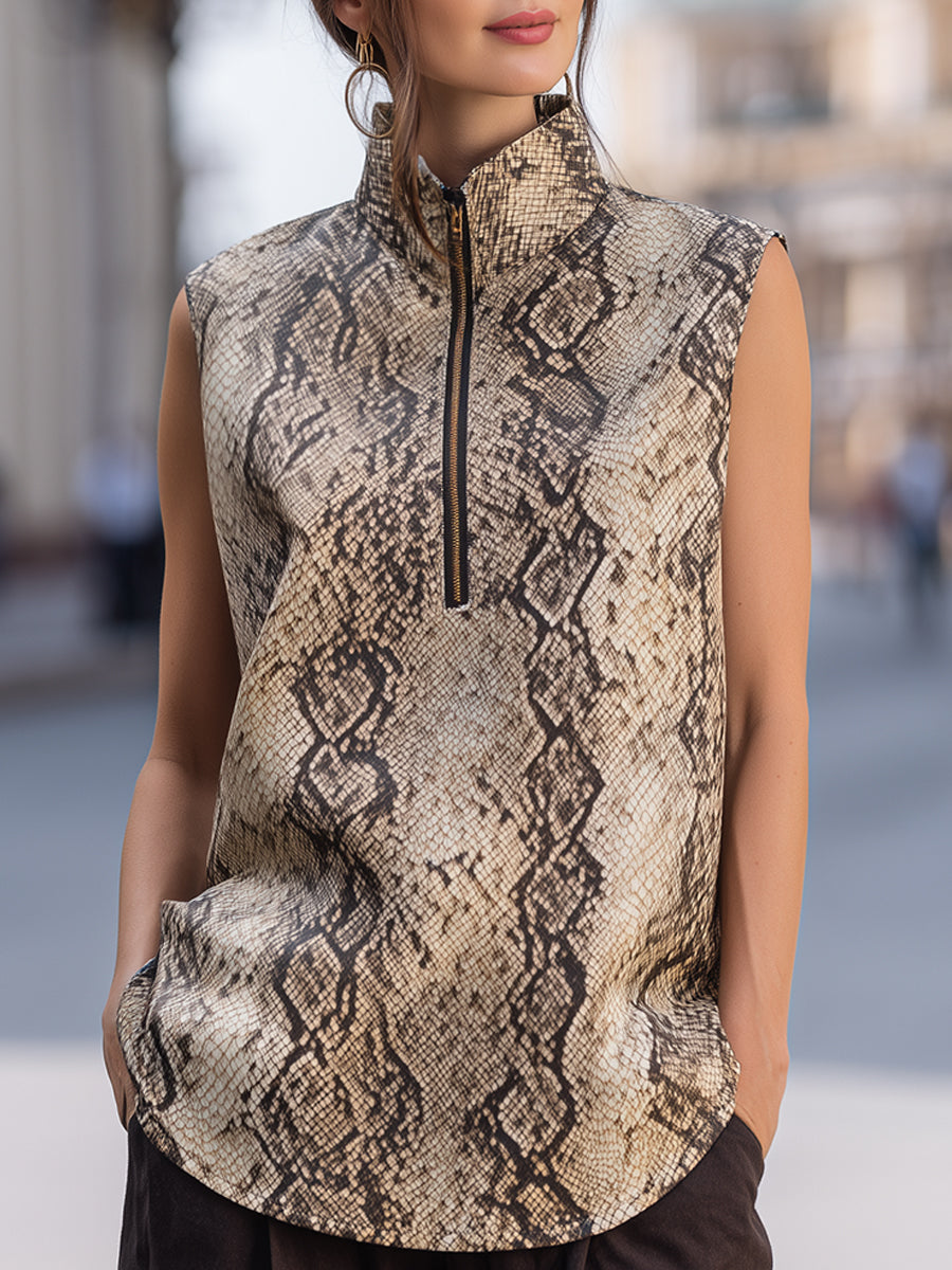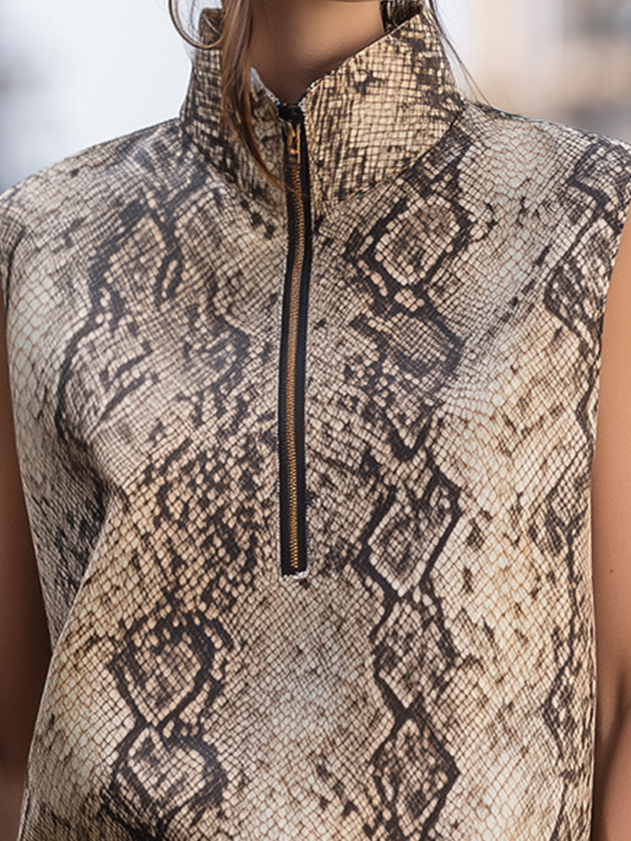 Þessi ermalausi toppur með snákamynstri og rennilás í hálsmáli býður upp á fágað yfirbragð, hannað fyrir sjálfsöruggar, nútímalegar konur. Hann jafnar djörf sjónræn áferð við hreina, byggingarlistarlega sniðmát og býður upp á áreynslulausa fágun sem hentar bæði í frjálslegan og fínlegan stíl.