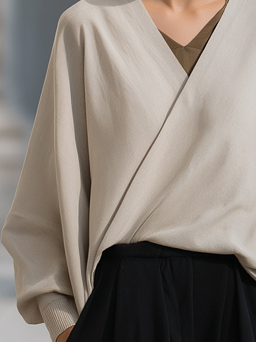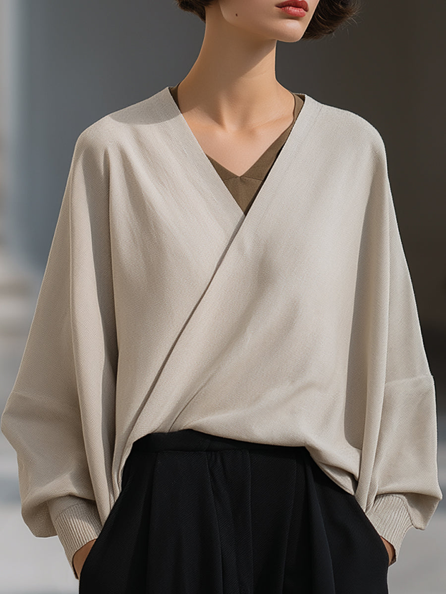 Þessi mjúka, vafningslaga prjónablússa með V-hálsmáli er hönnuð fyrir konur sem meta látlausan glæsileika og nútímalega fjölhæfni. Með hreinum línum og mjúku falli býður flíkin upp á fágað jafnvægi milli afslappaðs þæginda og fágaðrar fágunar, sem gerir hana að ómissandi viðbót við nútíma fataskápinn.